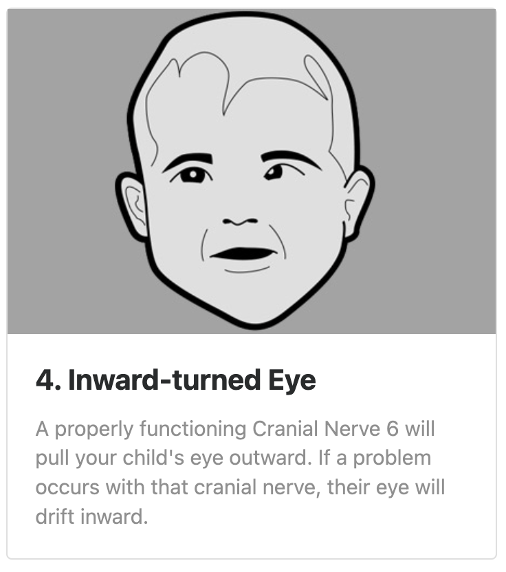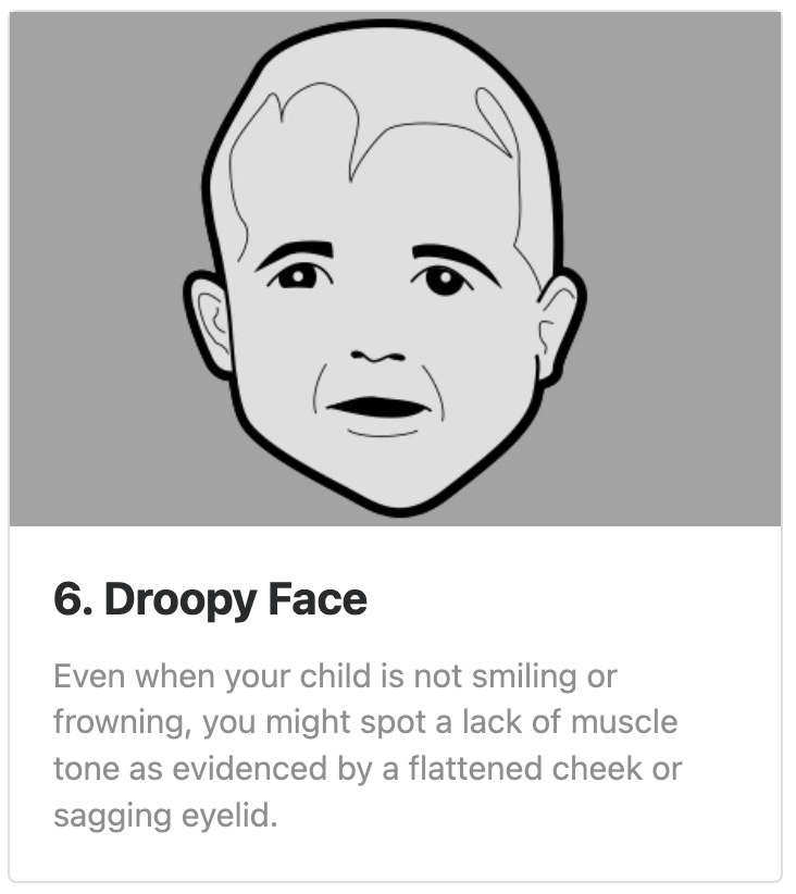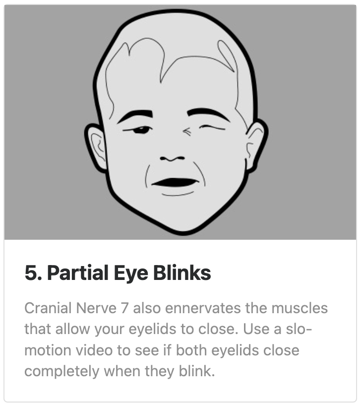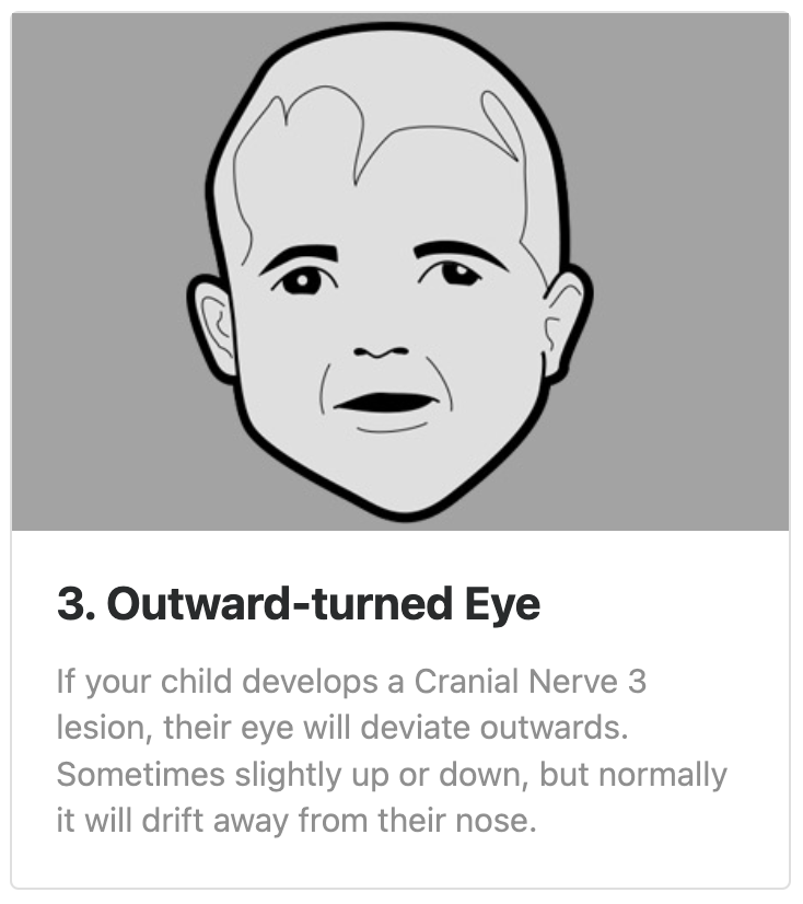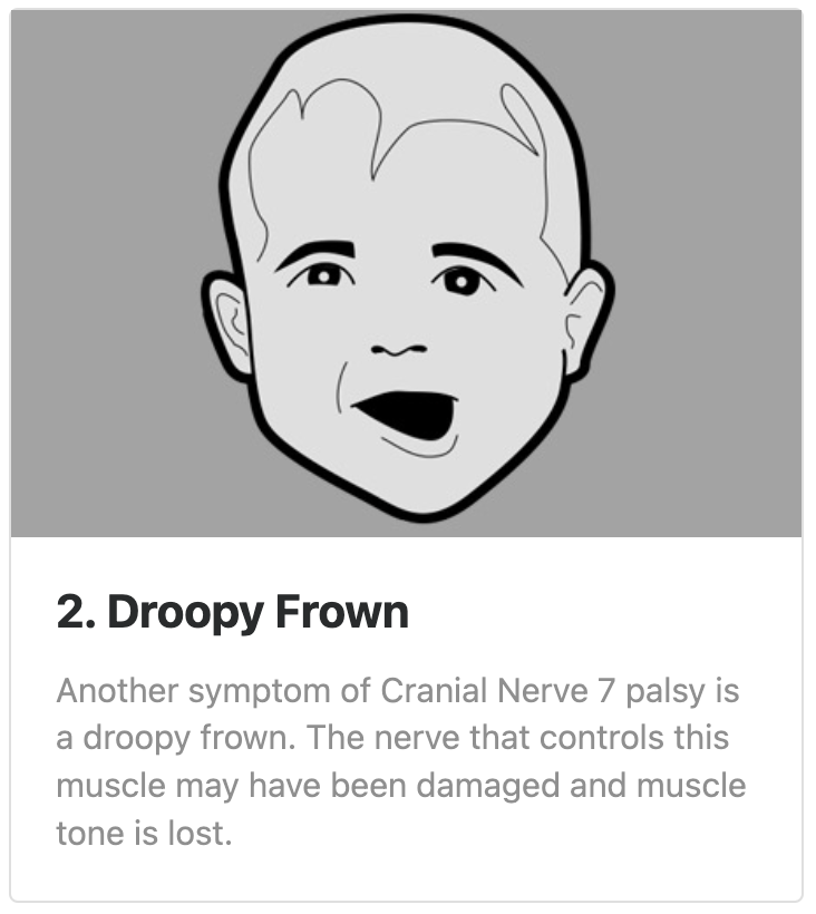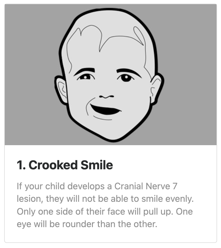 There are a few different ways your child might exhibit cranial nerve lesions. Although there are a few others, these are the most common faces to look out for. Use your phone to document your child's face and see if you can notice when it changed.